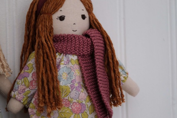 She wears a cotton dress sewn from Liberty of London fabric and her scarf is knitted from a cotton yarn. Her dress has velcro sewn in the back to make it easy for little fingers to take on and off. Ava's hair is created from a cotton and bamboo blended yarn and can be braided and styled with hairbands. Quality fabrics and fibres are always favoured.